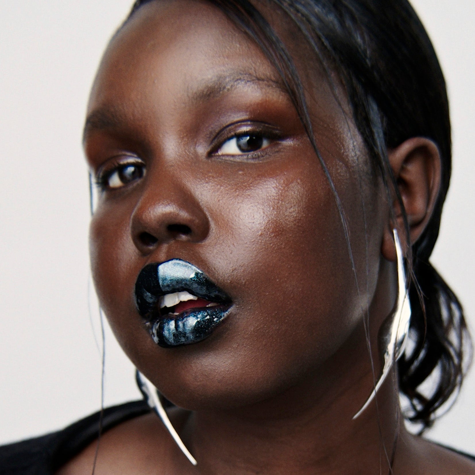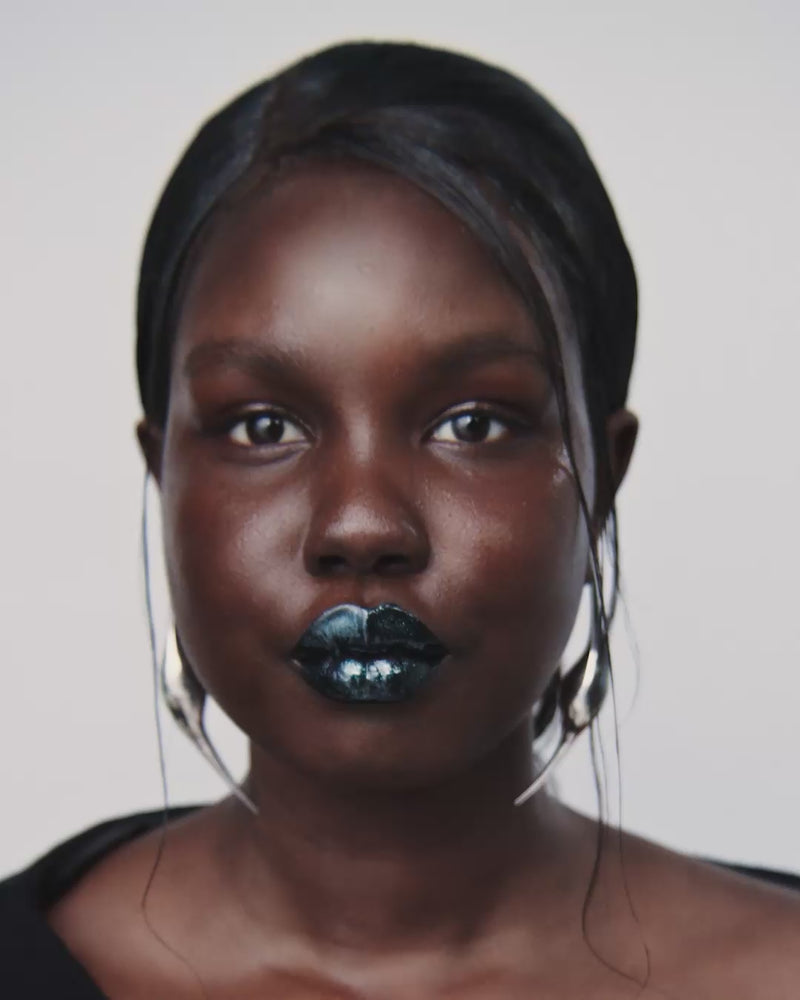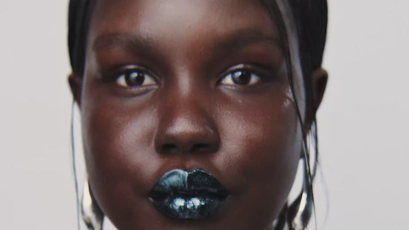Inky black lips gleam with a mirror-like finish. A fearless statement that celebrates individuality and modern allure.